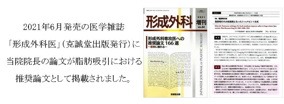 医学専門雑誌の「形成外科」(克誠堂)に当院院長の推奨する論文が、全国で選ばれた16人の形成美容外科医の一人として紹介されました。詳細は以下をご覧ください。