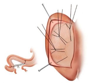 基本的に耳の外側の対輪(アンチヘリックス)という部分のスジがきちんとできていない場合やその折れ曲がりが弱い場合は、この部分の軟骨にマットレス縫合という方法で、折れ曲がりを作ったり、より強くしたりして、対輪を十分に形成します(右図参照)。