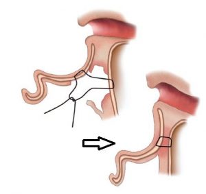 この方法だけでは耳が寝ない場合、耳甲介とよばれるカップ状の中央部分が立っている場合があります。その場合は、耳甲介を頭蓋骨に引き寄せる方法をとる場合もあります。