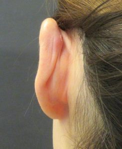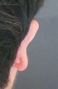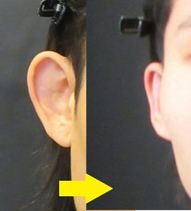 もう一つのタイプは、対輪の形成はあるものも、耳甲介という耳の内側のカップ状の部分の軟骨が、立っている場合もあります。この部分の軟骨の硬さにもいろいろ程度がありますが、こうしたケースでは耳甲介に糸をかけ、頭蓋骨側へ引き寄せる施術を行うこともあります。